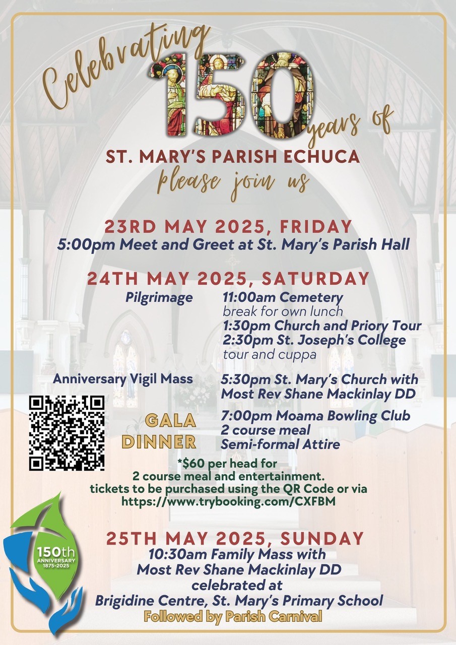 Following on from their Diocesan Anniversary celebrations, St Mary’s, Echuca has organised a full program to celebrate 150 years since their parish was established. Starting with a ‘meet and greet’ in the Parish Hall on Friday 23 May, followed by a Pilgrimage, Church and Priory Tour; Vigil Mass and Gala Dinner on Saturday 24 May.